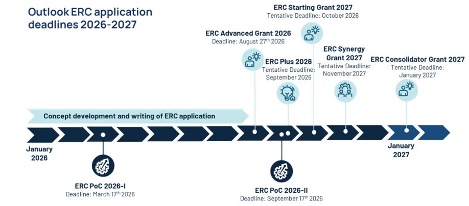 Before starting the application process, our advise is to critically assess the urgency of the problem, the original and ground-breaking nature of your approach, the level of ambition, as well as your unique positioning and the strategic timing to apply for an ERC within your career trajectory. As drafting an ERC proposal is the result of iterative development, starting preparation at least three to five months before the deadline allows time to refine the conceptual framing, sharpen the narrative, and ensure coherence in the description between ambition and feasibility (see figure below). The 2026–2027 Work Programme offers new opportunities, but also demands strategic clarity for which early reflection and careful positioning remain decisive in the pursuit of ERC excellence.